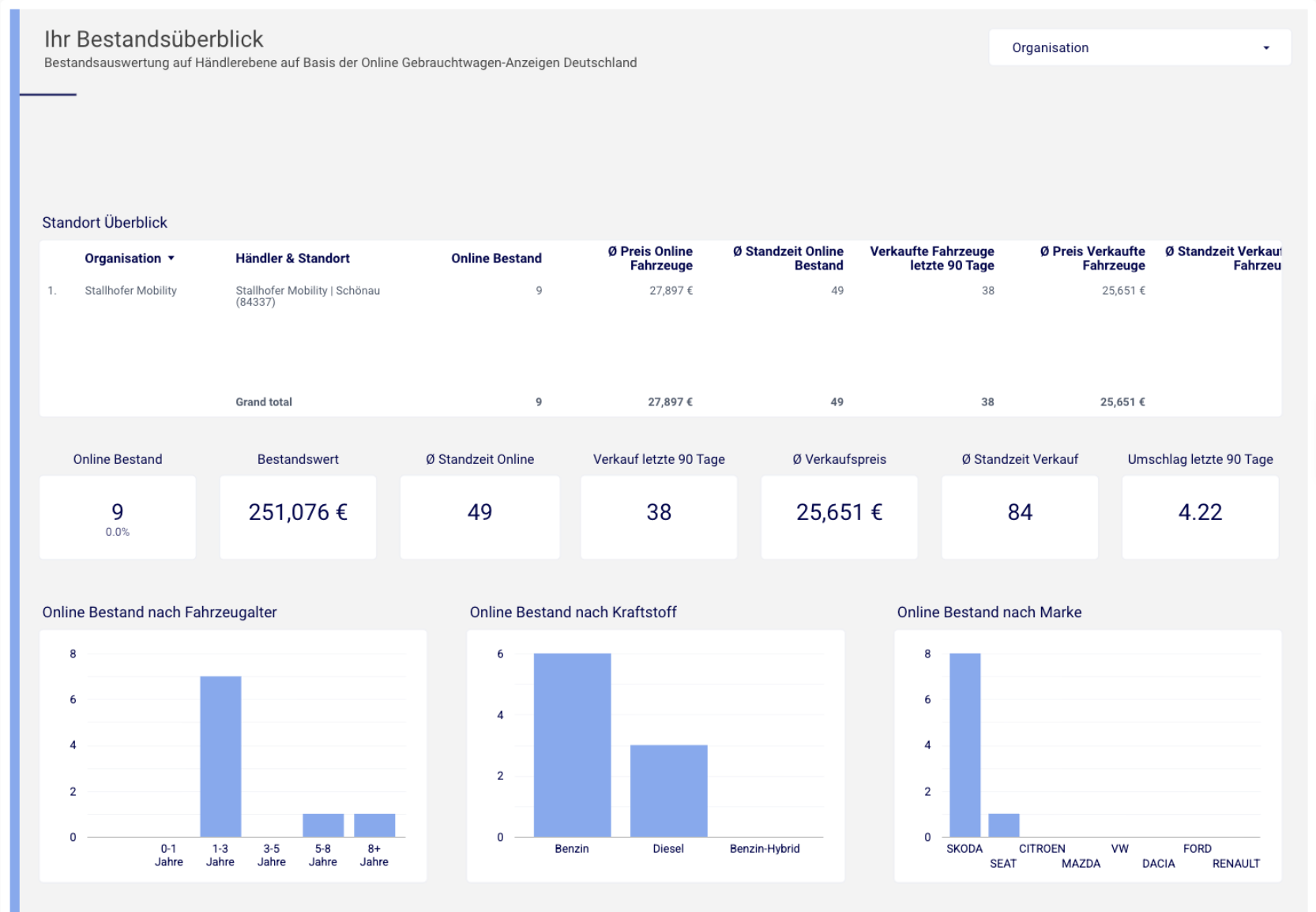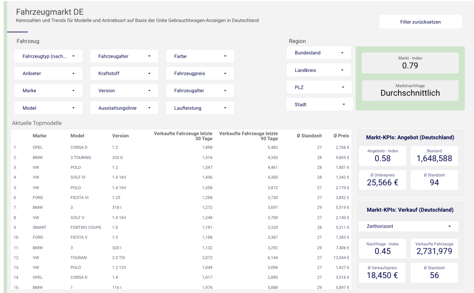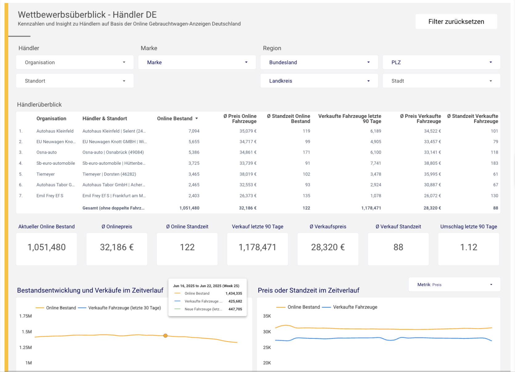 Verfolgen Sie Fahrzeugangebote und Verkaufszahlen in Ihrer Region oder bei Ihren Mitbewerbern. Erkennen Sie Trends frühzeitig, vergleichen Sie Ihre eigene Performance mit der Konkurrenz und leiten Sie direkt Maßnahmen ab, um Ihre Marktposition nachhaltig zu stärken. Analysieren Sie langfristige Entwicklungen in Fahrzeugnachfrage und Preisentwicklung, um fundierte Einkaufsentscheidungen zu treffen.